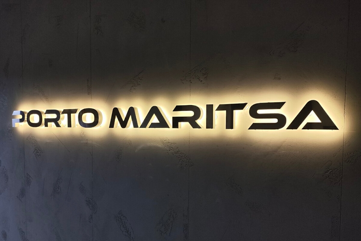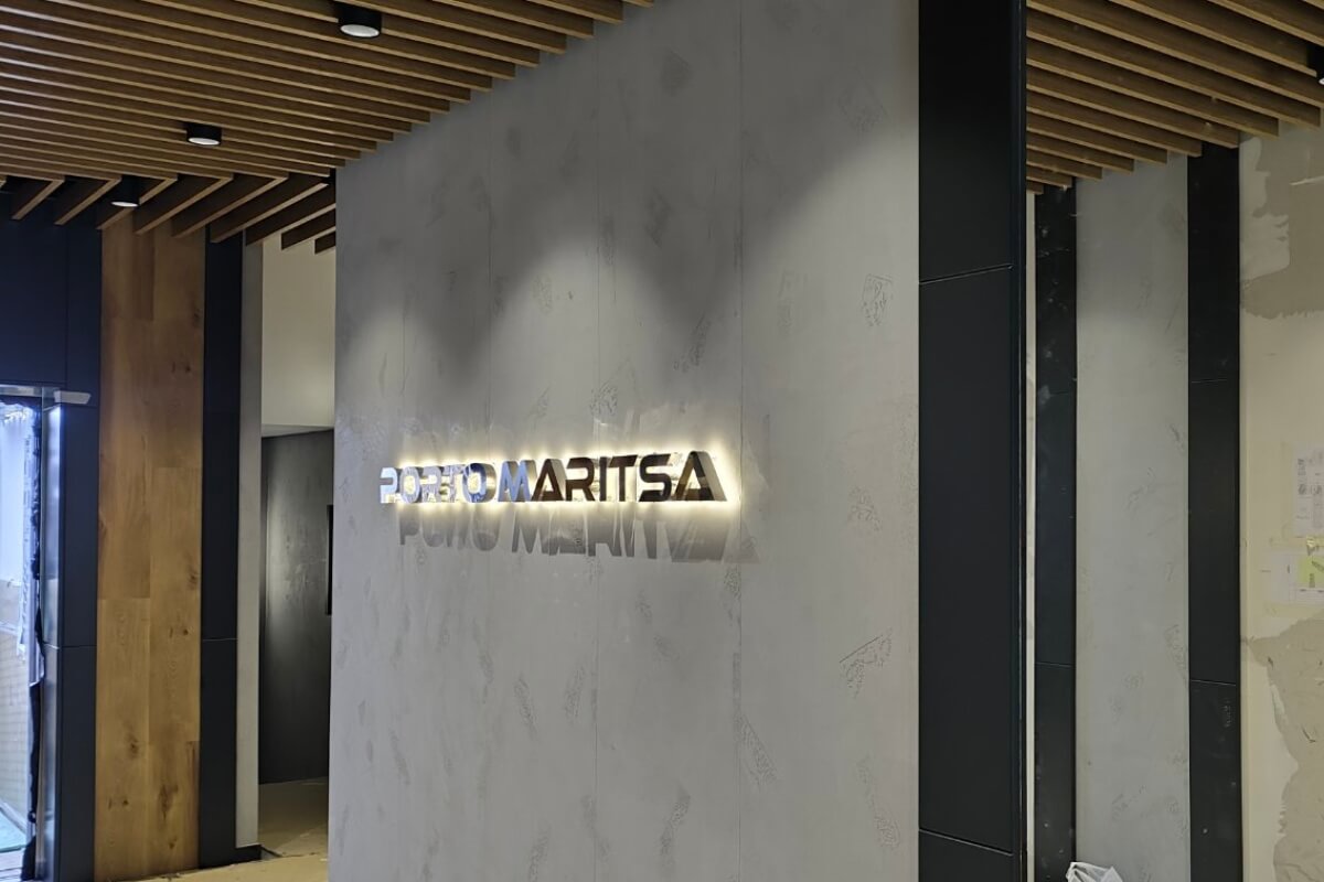Another outdoor project featured the inscription “Porto Maritsa” on one of the building’s walls. These channel letters, also illuminated but larger this time, were once again made from elegant brushed stainless steel. Mounted on spacers, they create a striking halo effect when lit. Together, the two exterior signs form a powerful visual presence that reinforces trust in IDL’s clients right from the entrance.