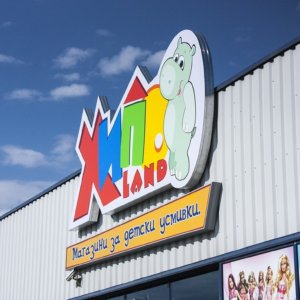 Логото на верига магазини за детски стоки Хиполенд е специфично и сложно за изработване на големи размери. Многото и същевременно едри детайли правят запазеният знак невъзможен за изпълнение от плексиглас.