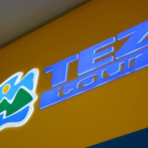 Табела от алуминиев композитен панел ETALBOND с вградени обемни букви от плексиглас. Клиент туристическа агенция Alfatour. Буквите са изработени от сандвич от два вида плексиглас – прозрачен 10мм и цветен 3мм. Засветени със светодиоди OSRAM.