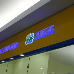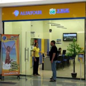 Вградени в алуминиева табела светещи обемни букви, офис Alfatour в МОЛ Галерия Пловдив